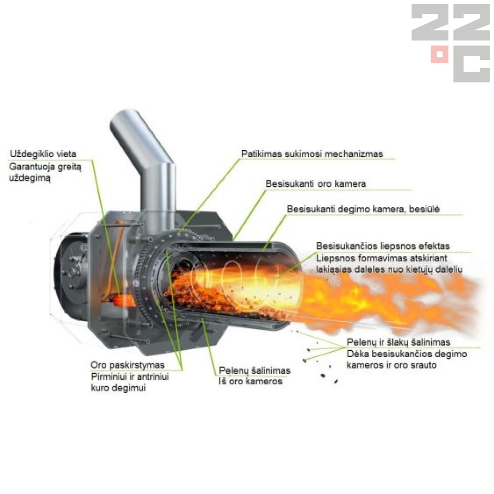 - Kombinuotas kūrenimas: Integruotas mikroprocesorinis valdymas leidžia lengvai perjungti režimus tarp automatinio granulių degimo ir rankinio kietojo kuro (malkų, briketų) krovimo.