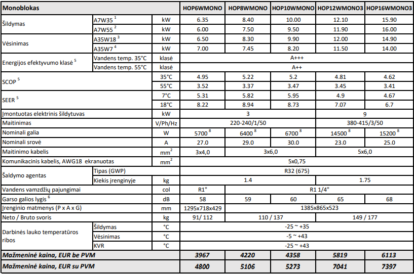 | Sezono šildymo naudingumo koeficientas SCOP (W 35°C) | 4.95 | 5.2 | 4.81 | 5.22 | 4.62 |